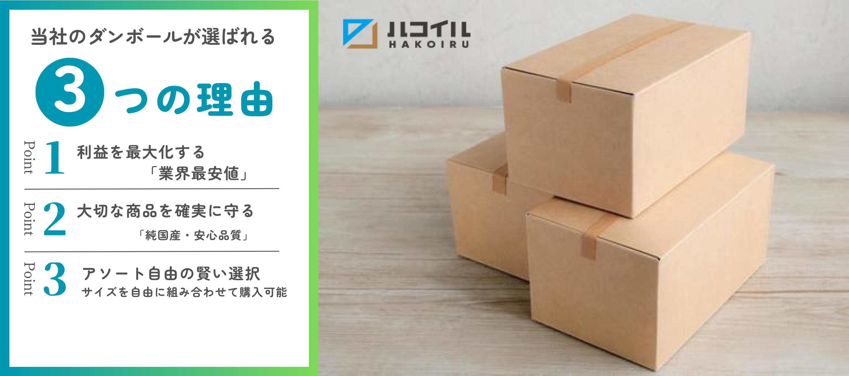 ダンボール購入、もう迷わない!純国産の安心品質と最安値を両立し、選んだカテゴリー内の10種サイズを合計60枚まで自由にアソート購入可能。無駄な在庫と経費をゼロ化し、あなたの利益を最大化します。